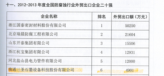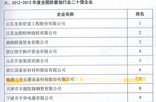 在剛剛閉幕的第五屆中國國際腐蝕控制大會上,南通三圣石墨設(shè)備科技股份有限公司憑借其優(yōu)異的業(yè)績榮登三大榜單,分別是:"2012-2013年度全國防腐蝕行業(yè)二十強企業(yè)"(排名第7位);"2012-2013年度全國非金屬壓力容器企業(yè)二十強"(排名第1位);"2012-2013年度全國防腐蝕行業(yè)外貿(mào)出口企業(yè)二十強"(排名第6位)。