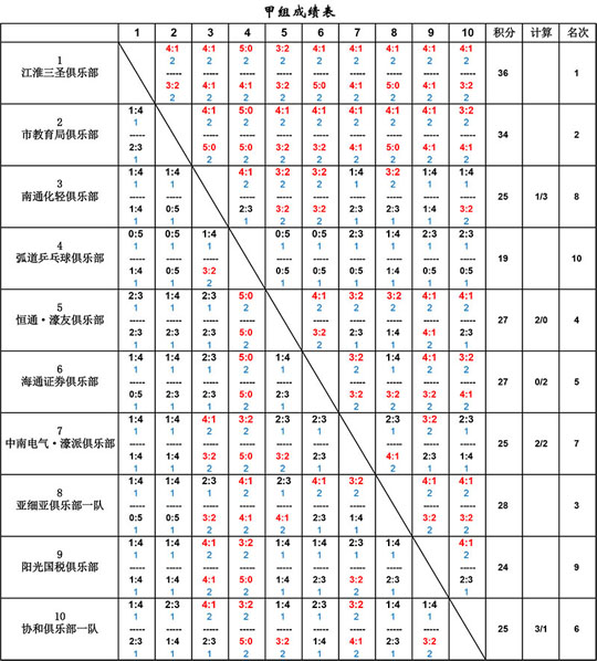 截止2013年12月15日,2013年南通市第五屆"城市嘉苑杯"乒乓球俱樂(lè)部聯(lián)賽完成了甲組、乙組、丙組的全部比賽,甲組成績(jī)公告如下:
